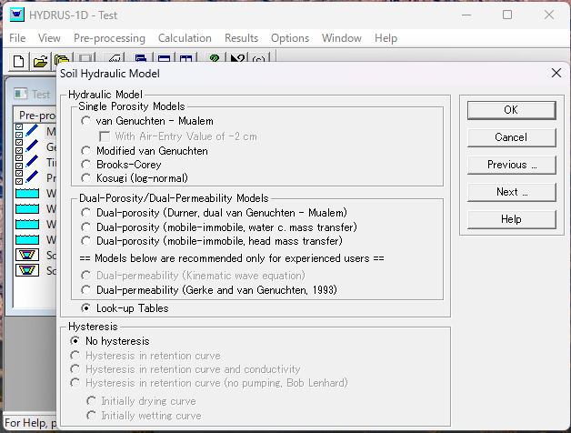 Save Mater.in in the HYDRUS project directory, and then specify Look-up Tables in Soil Hydraulic Model to use this function in the simulation.