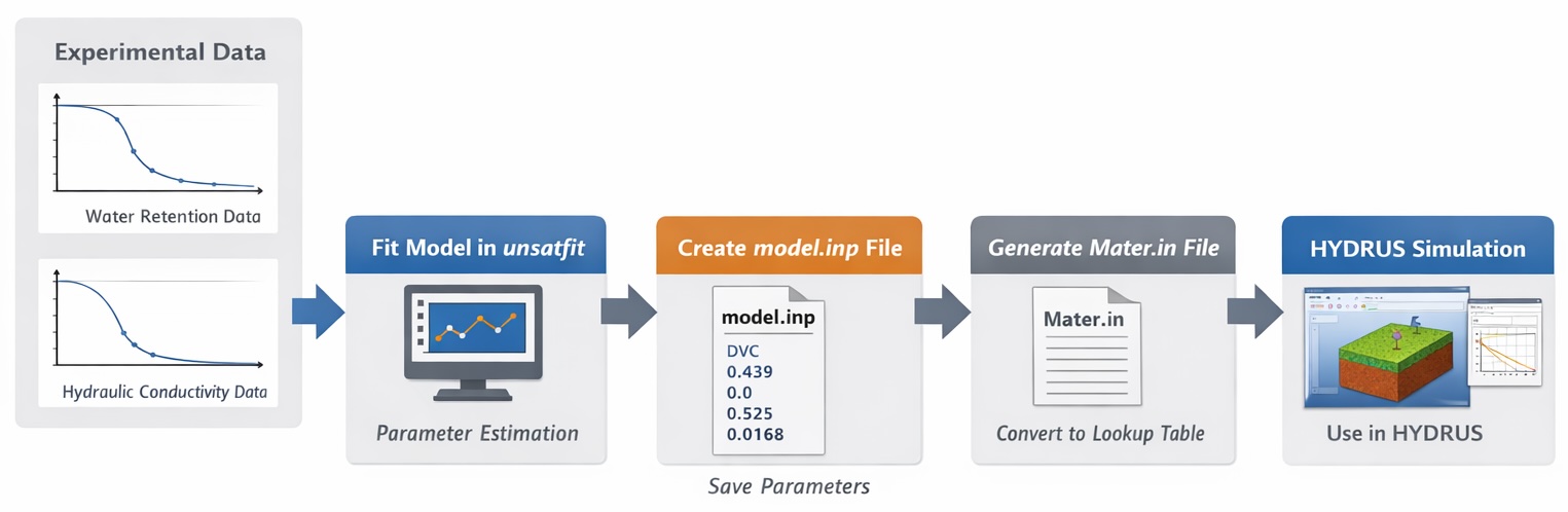 HYDRUS is a software package for simulating the movement of water, heat, and dissolved substances in soil and other porous materials. In unsatfit, you can estimate the parameters of a water retention function (WRF) and a hydraulic conductivity function (HCF) from experimental data used in such simulations. However, HYDRUS does not directly support all analytical hydraulic models available in unsatfit. Instead, it can use hydraulic functions supplied through a discrete lookup table stored in Mater.in. This limitation can be addressed by converting a fitted unsatfit model into a Mater.in file that HYDRUS can read.