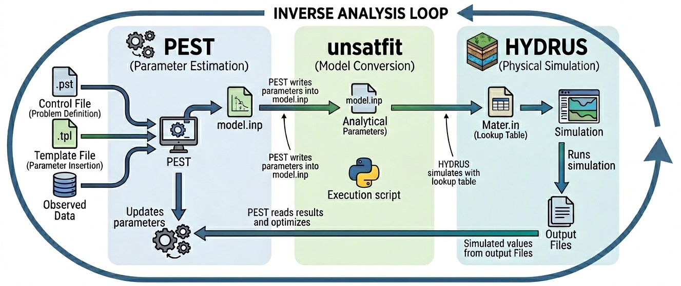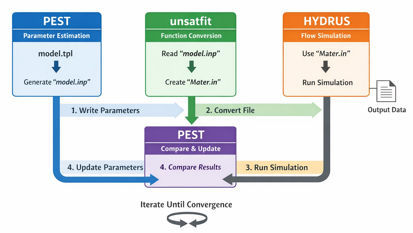 When PEST is used together with HYDRUS, it allows estimation of soil hydraulic parameters by repeatedly running HYDRUS simulations and comparing the calculated results with observations. However, when using a hydraulic function that is available in unsatfit but is not supported directly by HYDRUS, an additional step is needed. HYDRUS reads hydraulic properties through Mater.in lookup tables, whereas unsatfit handles analytical WRF (water retention function) and HCF (hydraulic conductivity function) models and their parameters.